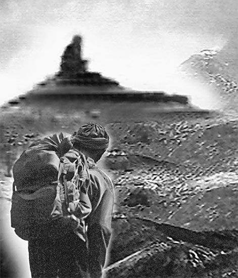 Когда мы лезли вверх по склону, в голове всплыли слова, сказанные «старшим человеком» пещеры Харати и Астаманом о том, что статуя Читающего Человека притягивает к себе облака и редко кому ее удается увидеть. Я вспомнил, что «старшему человеку», посещавшему район священного Кайласа в качестве паломника, не выпала удача увидеть статую Читающего Человека.