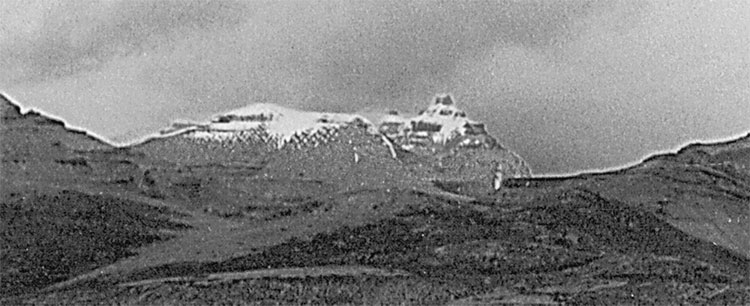 Дойдя до нужного места, мы установили штатив и сделали съемку при максимальном увеличении, после чего я начал рисовать, всматриваясь в окуляр видеокамеры. Было вполне четко видно, что это и в самом деле громадная статуя человека, сидящего в позе Будды. К сожалению, условия видимости в высокогорье, когда все тени черные и плохо видны полутени, не позволяли рассмотреть детали статуи. Но я надеялся на последующую компьютерную обработку снимков. Тем не менее, было видно, что голова статуи склонена вперед, будто бы этот громадный человек читает книгу, лежащую на коленях. Статуя располагалась на многоступенчатом постаменте, а вернее была установлена на вершине ступенчатой пирамиды, высота которой была не менее 6000 метров. Статуя была повернута лицом на восток. Примерное расстояние до статуи Читающего Человека равнялось 25–30 км. Размер статуи мы оценили как минимум с 10–12-этажный дом.