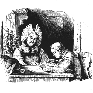 Der Hans sitzt am Sonntag bei der Mutter. Die Sonne scheint durch das kleine Fenster auf die schönen Blumen. Die Mutter hat ihr Sonntagskleid angezogen und die blütenweiße Spitzenhaube aufgesetzt.