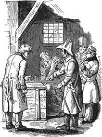 „Siehst du, Hans, so sieht eine Zollstation aus. Vor fast zweitausend Jahren, als Jesus bei uns auf Erden lebte, sah natürlich eine Zollstation noch anders aus. Die Menschen trugen damals auch andere Kleider. Vorn, mit dem großen Hut auf dem Kopf, den Stock in der Hand und dem Säbel am Mantel, steht der Zollinspektor. Solch ein Mann war Zachäus. Wenn Kisten mit Waren aus Syrien nach Israel über die Grenze kamen, wurden die Reisenden aufgefordert, die Kisten zu öffnen. Siehst du auf dem Bild dort hinten die geöffnete Kiste?