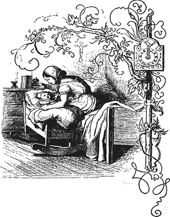 Die Mutter des kleinen Babys war ganz erschrocken und bleich, als sie die bösen Menschen sah, die vor der Tür standen. Schnell lief sie zu der Wiege, legte ihre Hände über das Kind und begann mit lauter Stimme zu singen:
