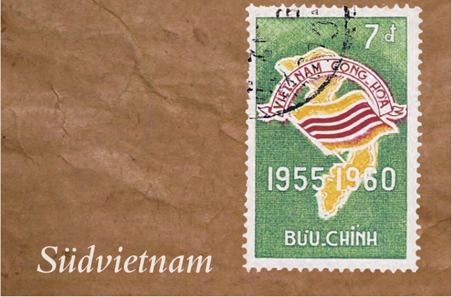 Auf der Genfer Konferenz verzichtete Frankreich 1954 auf seine indochinesischen Kolonien und entließ sie, nach einem langen und zähen Krieg, in die Unabhängigkeit. Doch da war Vietnam bereits in zwei Teile zerbrochen: in eine kommunistische Nord- und eine westlich orientierte Südhälfte, die sich an ihrer schmalsten Stelle berührten. Natürlich erklärten beide das Land für unteilbar. So ist der Norden auf dieser Briefmarke Südvietnams mitvertreten, wenn auch in einer merkwürdig abgeknickten und verschobenen Position, wobei die eigentliche Bruchstelle durch die südvietnamesische Flagge verdeckt ist.