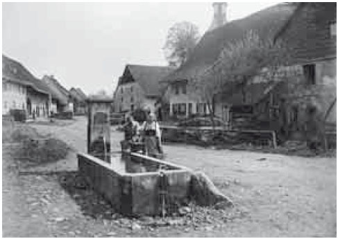 Unter mühseligen Bedingungen produzierten Kleinbauern auf winzigen Flächen für den Eigenbedarf. Im Dorf gab es zudem eine Anzahl Rebberge. 1866, zwei Jahre nachdem Marie mit ihrer Familie Bözen verlassen hatte, fand eine Viehzählung statt. Sie erlaubt einen Blick auf die wirtschaftlichen Verhältnisse. In Bözen lebten im Stichjahr 1866 82 Kühe, 99 Schweine und 85 Ziegen, jemand besass zwei Schafe, keiner der Bauern hatte ein Pferd.7 Der Charakter dieses Viehbestands deutet auf ein armes Dorf, man zählte mehr Ziegen als Kühe, die Milch diente in erster Linie der Selbstversorgung. – Im April 1902 machte Marie mit ihren Kindern einen Ausflug nach Bözen und zeigte ihnen ihr Geburtshaus und «Grossdättes» Kirche. Ihr Sohn Arnold hielt das Ereignis fotografisch fest: Noch zu Beginn des 20. Jahrhunderts holten die Frauen Wasser am Dorfbrunnen.8