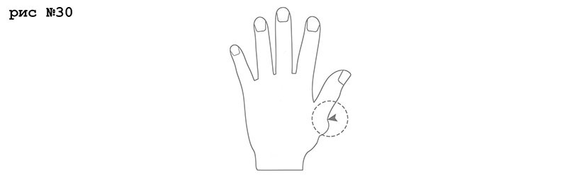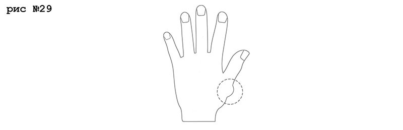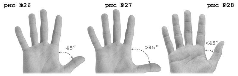 Изучая большой палец, обратите внимание на то, под каким углом он расположен по отношению к ладони. Это и есть угол гостеприимства. Чем он больше, чем щедрее человек. У основной массы населения он составляет 45 градусов (рисунок №26), что указывает на умеренный консерватизм и желание следовать традиционным нормам.