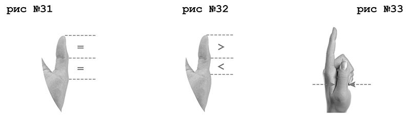 Если верхняя и средняя фаланги большого пальца одинаковой длины (рисунок №31) значит, человек в равной степени владеет как логикой, так и силой воли. Он воплощает в жизнь все свои идеи.
