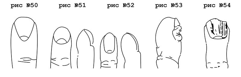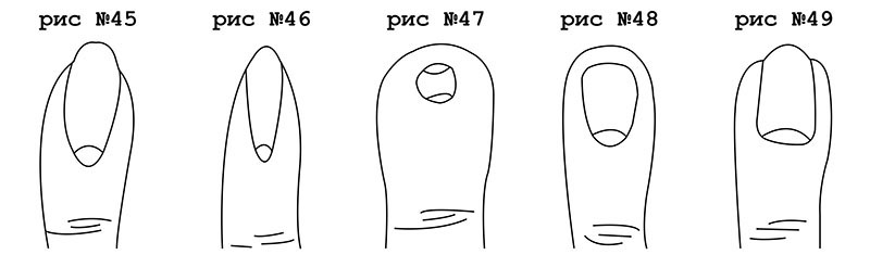 Когда же широкая часть трапециевидного ногтя расположена возле ногтевого ложа (рисунок № 49), то значит человек подвержен болезненным фантазиям, которые могут оторвать его от реальности и привести, в конце концов, к серьезным отклонениям в психике.