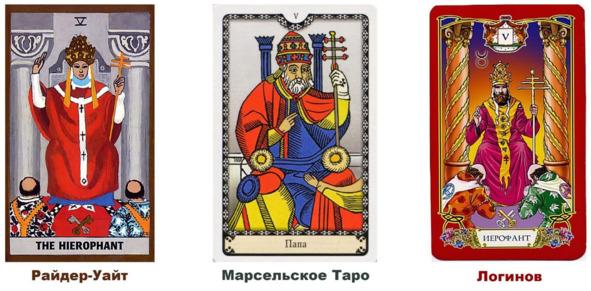 Иерофант облачен в ризу священнослужителя, в левой руке он держит скипетр, а правой – благословляет. Одежда Жреца может меняться от колоды к колоде, а скипетр представлять символ той веры, которую исповедует автор колоды. Иерофант, наклонившись вперед, благословляет двух людей, стоящих перед ним с покорно опущенными головами. Во всех трех колодах, представленных вашему вниманию, центральная фигура карты, подобно Верховной Жрице, расположена между двумя колонами.