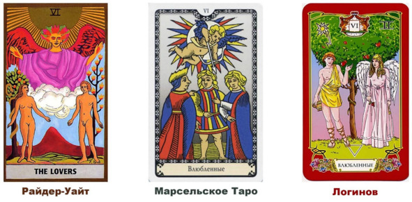 На карте изображены двое молодых влюбленных, обнаженных (как в Таро Райдера) или одетых (как в Марсельской колоде или в современной версии Таро Логинова). В некоторых старинных колодах (в том числе и во французском Таро), кроме этих двоих, присутствует третий человек – наблюдатель, перед которым молодые люди изъясняются. Здесь также можно увидеть ангела (колода Райдера и Марсельское Таро) и змея – искусителя, обвивающего дерево (колоды Логинова и Райдера).