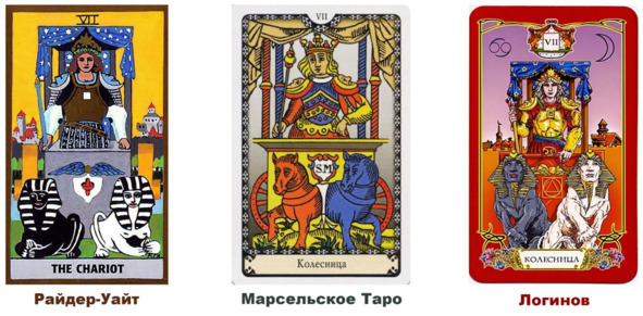 На Аркане изображен царственный муж, правящий колесницей. В его правой руке жезл – символ власти. Колесницу везут два зверя, реальных (например, кони на карте Марсельского Таро) или мифических (в колодах Логинова и Райдера-Уайта это сфинксы). Животные раскрашены в разные цвета. Они как будто скачут в противоположных направлениях, но везут одну колесницу. Это символизирует разные черты человеческой природы, например, тело и дух, которые тянут в разные стороны, но ведут к единой цели.