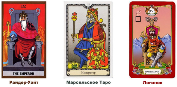 На карте изображен зрелый мужчина с окладистой бородой. Он сидит в определенной позе: положив одну ногу поперек другой (Марсельское Таро и колода Логинова). Особое положение ног Императора указывает на основной смысл карты: все должно иметь законченную форму. В руках Хозяина символы власти, а к трону, на котором он восседает, прислонен щит. В колоде Райдера Император облачен не только в мантию, но и доспехи. Как щит, так и доспехи символизируют способность человека встать на защиту всего того, что ему дорого. Интересно отметить, что трон, на котором сидит Император, имеет украшения в виде головы барана, что указывает на связь карты с зодиакальным знаком «Овен».