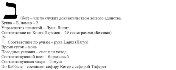 Согласно каббалистическим ключам, карта «Верховная Жрица» отождествляется с буквой бет, которая в этом случае будет звучать так: «Число служит доказательством живого единства» (см. главу №5, раздел «Каббала и Таро»).