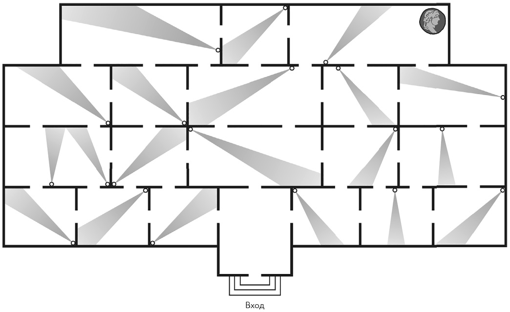 После долгих наблюдений вы составили план большого художественного музея (он показан на картинке ниже) и обозначили места, которые просматриваются в двадцать скрытых камер.