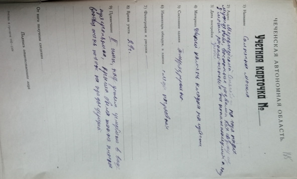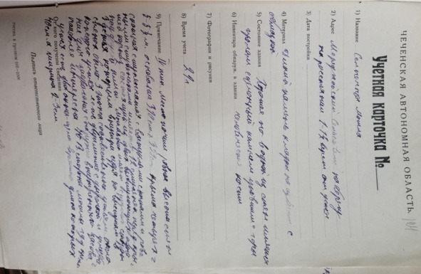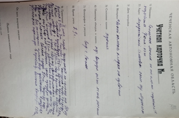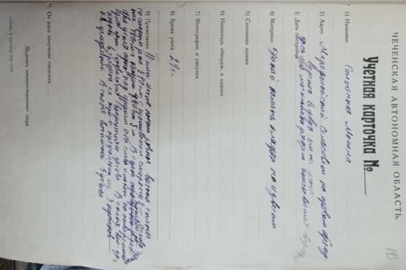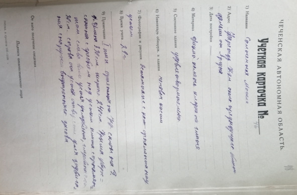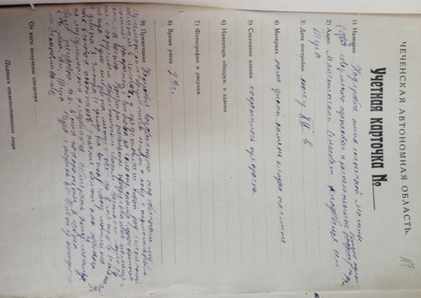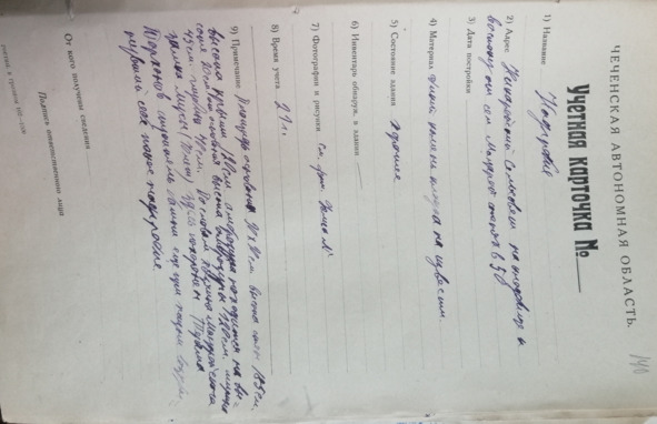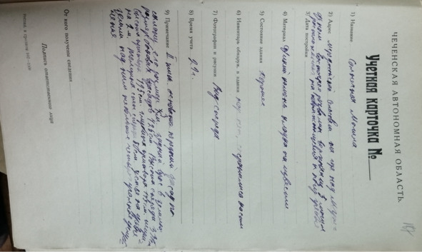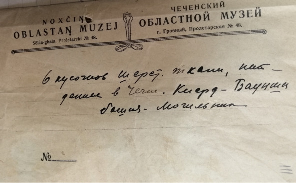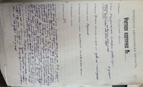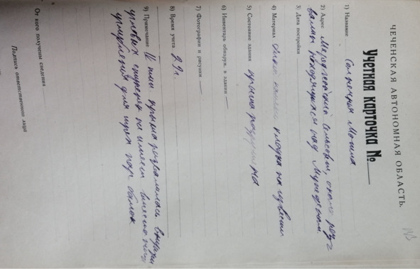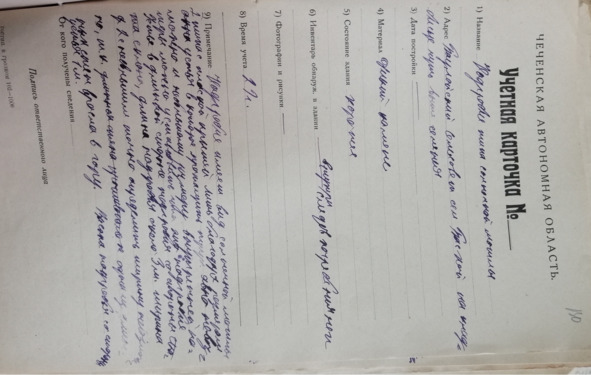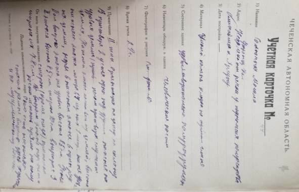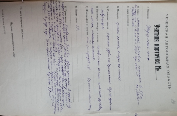 Ножай-Юртовский округ – Ж5 64—00, 43—15. Случайные находки различных предметов украшений (медные, браслеты, бусы, орнаментированные зеркала, фибулы, серьги, подвески, булавка лопатообразной формы), железных наконечников стрел и каменного песта. Хранятся в Музее Антропологии и Этнографии АН СССР. Поступили от М. Ф. Мячина в 1928 г. Коллекция №3772.