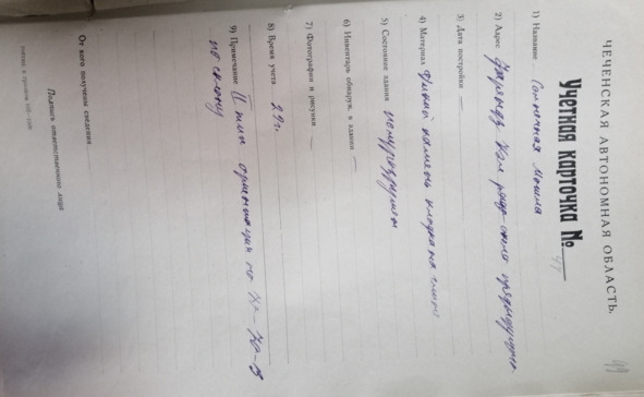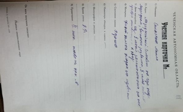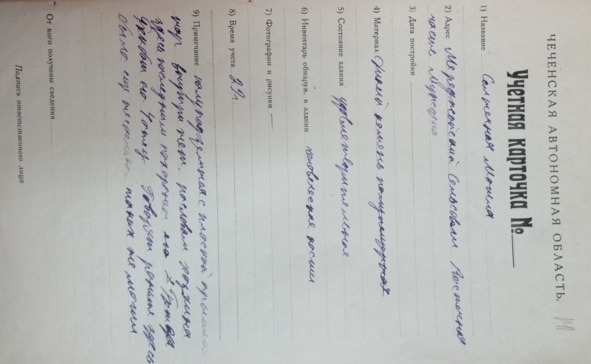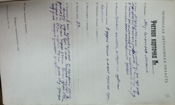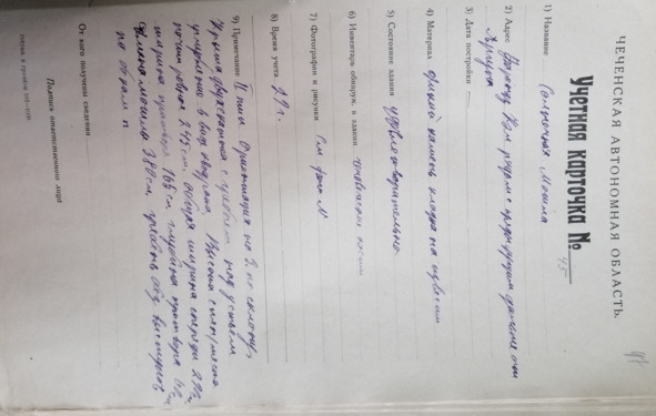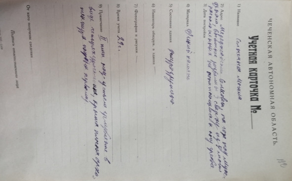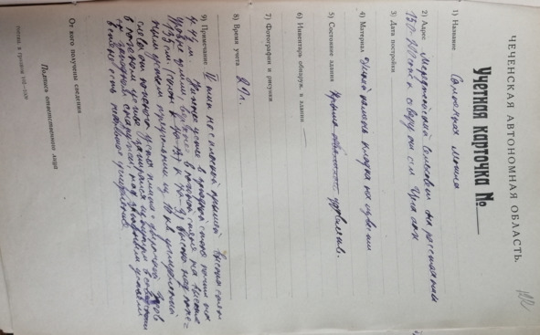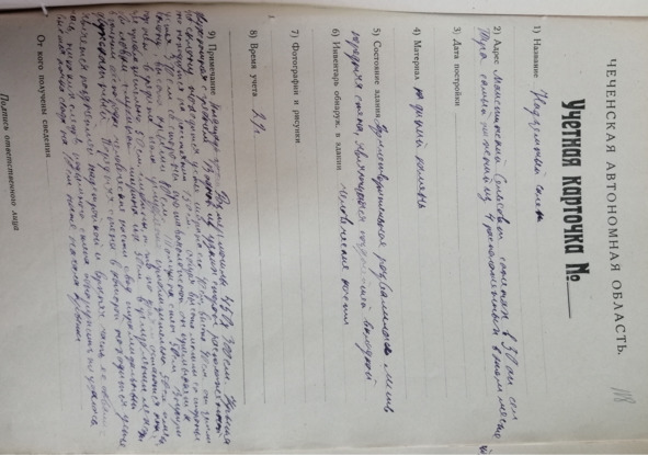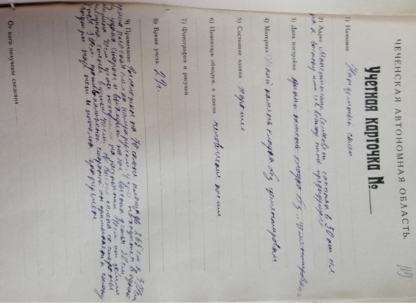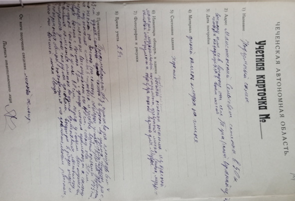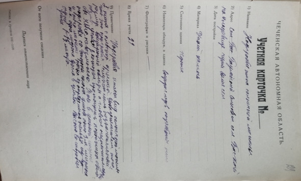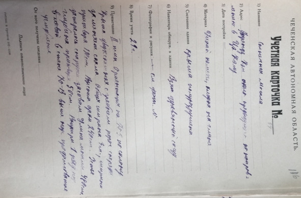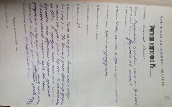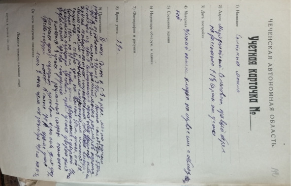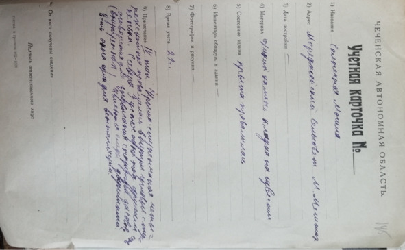 Ножай-Юртовский округ – Ж5 64—00, 43—15. Случайные находки различных предметов украшений (медные, браслеты, бусы, орнаментированные зеркала, фибулы, серьги, подвески, булавка лопатообразной формы), железных наконечников стрел и каменного песта. Хранятся в Музее Антропологии и Этнографии АН СССР. Поступили от М. Ф. Мячина в 1928 г. Коллекция №3772.