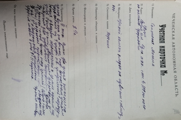 Долина р. Акки-хи, близ с. Амки. Башня красивой архитектуры, известная под именем Мозыр-Юрт, расположена на высоком скалистом утесе у входа в ущелье у устья бокового оврага. На противоположной стороне оврага – развалины башен, меньших размеров. Несколько ниже башни, ближе к берегу речки находится четырехугольный продолговатый склеп с глубокими нишами на наружных стенах.