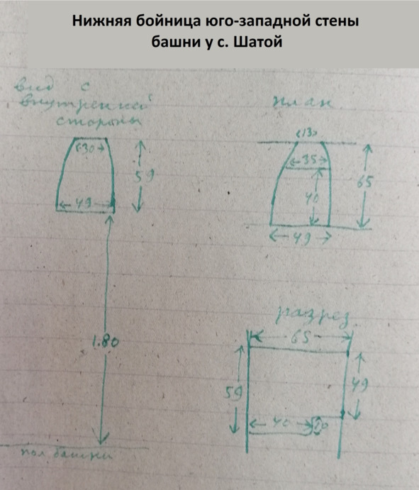 Стр. 31 …Башня у с. Шатой. На расстоянии 1 км от с. Шатой, вниз по течению р. Аргун, на левом ее берегу, стоит каменная башня. Башня стоит на уступе горы ограниченном с одной (восточной) стороны р. Аргун, с другой (северной) ущельем. Башня сложена из плит глинистого сланца, различного размера, положенных на глине. Основание башни почти неправильный, равносторонний четырехугольник (см. чертеж альбом №1, стр. 15). Толщина стен колеблется от 72 см до 65 см. Северо-западная стена башни пробита в нижней части. Башня к верху слегка суживается. В северо-западной части (разрушенной в нижней части) находилась дверь, шириной в 90 см (в нижней части), одно большое и на самом верху одно маленькое окно. Юго-восточная смена имела два окна, одно на половине высоты, другое в верхней части. В северо-западной и юго-восточной стенах, выходящих в сторону горы, окон нет, имеются только бойницы, по пять бойницы, по пять бойниц в каждой из стен. Бойницы расположены в три ряда. В первом и втором по две бойницы, в третьем одна на каждой из этих двух стен. Бойницы имеют следующие размеры (см. на обороте чертеж нижней бойницы юго-западной стены). Ширина снаружи 13 см., ширина с внутренней стороны внизу 49 см, сверху 30 см. С внутренней стороны юго-восточной стены у западного южного углов имеется по одной маленькой нише. В северо-западной стен у северного угла одна маленькая ниша.