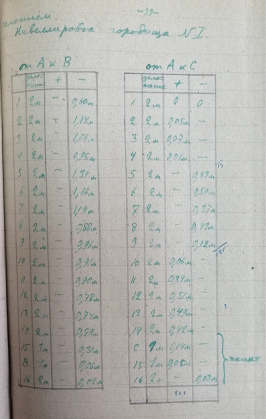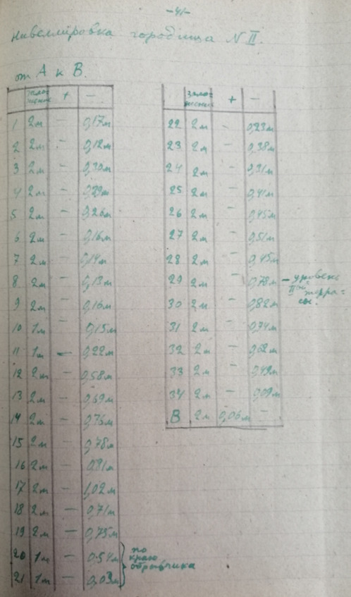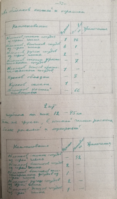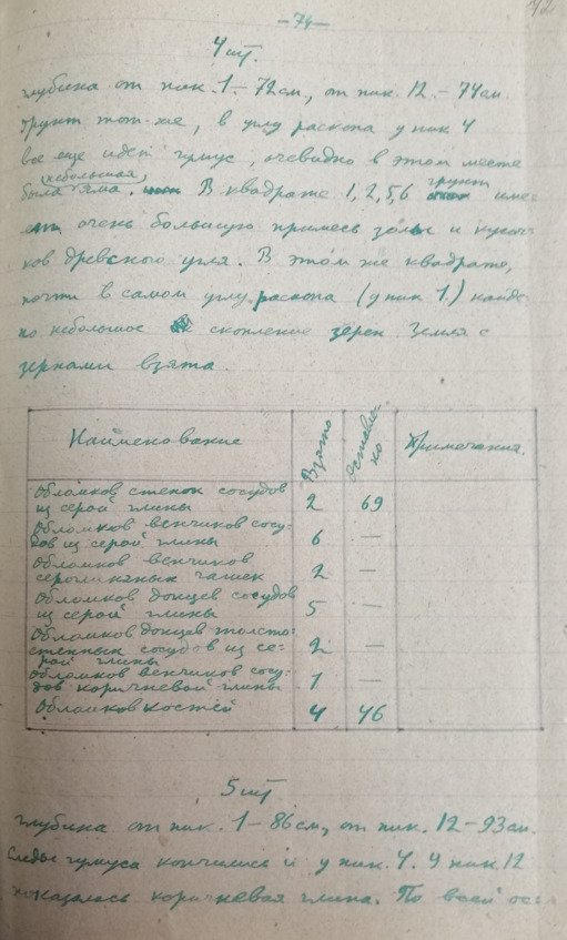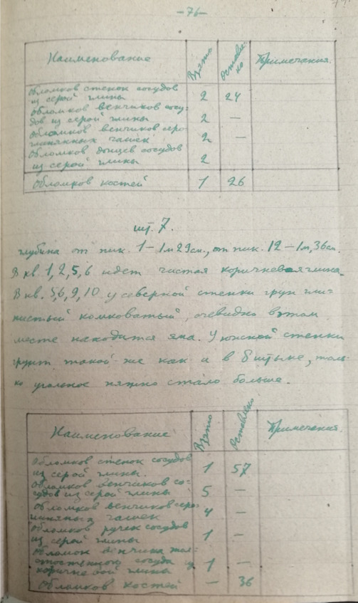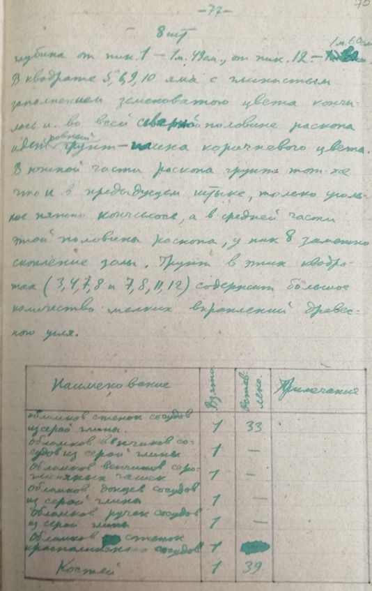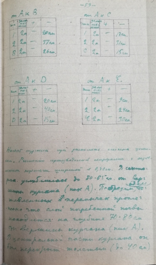 Стр. 66 …В большом количестве имеются курганы различной величины. Наибольшее количество курганов находится вблизи с Алхан-Кала, против сс. Кулары и Алхан-юрт. Курганы примыкают к очень большому городищу расположенному на берегу Сунжи. Многие курганы носят на себе следы грабительских раскопок. Как сообщают местные жители при постройке элеватора был разрушен большой курган. Находились глинистые сосуда и разнообразные вещи. Осмотрено упомянутое выше городище и собран объемный материал. Найденная керамика относится к первому веку? нашей эры (обломок ручки амфоры римского времени) к раннему средневековью. Договорились в с. Алхан-Кала о рабочих для постановки на городище разведочные раскопки.