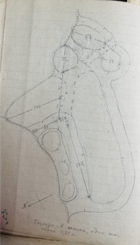 Стр. 30 …Осматривали окрестности с. Шатой. Проводником был Шамсад Шамилев. Им был указан могильник расположенный на северном обрывистом склоне оврага образованного пересохшим ручьем, впадавшим в р. Херчой-Эхк (Шамсад Шамилев назвал ее Верд-Эхк). Ручей по словам Ш. Шамилева называется Хакойский Кешне-ин. Могильник расположен к юго-востоку от сел. Шатой. На высоком обрывистом склоне видны входы восьми погребений. Погребения имеют вид пещер глубиною в 2 и более метров. С одной пещеры сделан схематичный чертеж (см. альбом №1, стр. 15). Дно этой пещеры завалено обломками камня, ни костей, ни остатков каких-либо вещей не имеется. Могилы по словам Шамсада Шамилева давно разграблены. В них были найдены «целые кувшины и человеческие кости». Все вещи были давно увезены каким-то приезжим (русским). Пещеры расположены на различной высоте, ближе к верхнему краю обрыва. Некоторые из них частично обвалились.