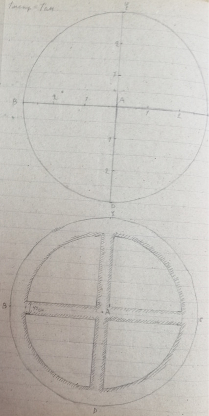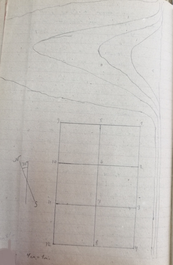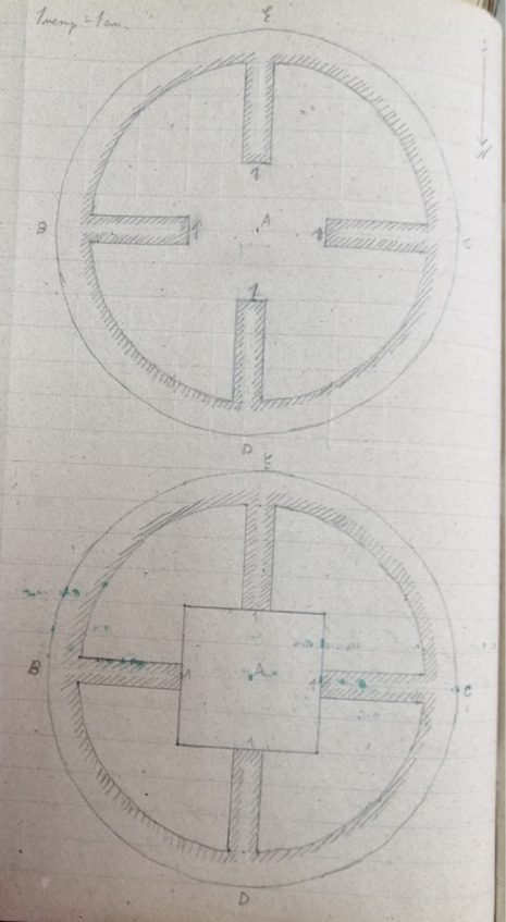 Стр. 8 … 14 августа. Приступили к разведочным раскопкам могильника №1. Работает 12 человек рабочих. Произведена подчистка северо-западного обреза холма. Обрез образован карьером кирпичного завода. При подчистке, в северо-восточной части обреза, было замечено пятно мешаной земли хорошо выделявшееся на глинистом грунте. Мешанная земля, имевшая сероватый цвет и заключавшая в большом количестве известковые выражения, была постепенно выбрана. В результате этой работы был обнаружен коридор катакомбы (см. предварительный набросок: альбом №1, стр. 1). Коридор имел высоту: в начале 1,28 м, в конце 1,05 м, причем пол его слегка понижался. В ширину коридор имел 40—50 см и слегка расширялся в глубину. Начало коридора лежало на глубине 3 м 20 см, (от поверхности почвы до пола коридора). Коридор вероятно начинался от колодца, последний был, очевидно срыт при добыче или для кирпичей. Коридор, имевший в сохранившейся части протяжение в 80 см, кончался резким понижением и переходом в отверстие имевшее 40 см в ширину и 48 см в высоту. Отверстие было заложено, едва закрывавшим его камнем. Камень (известняк) имел неправильную четырехугольную форму (см. альбом №1, стр. 1). Длина 48 см, ширина 44 см. длина узкой части прохода около 30 см. узкий проход выходил в катакомбу со сводчатым, почти стрельчатым потолком. На дне катакомбы лежали костяки засыпанные землей обвалившейся с потолка.