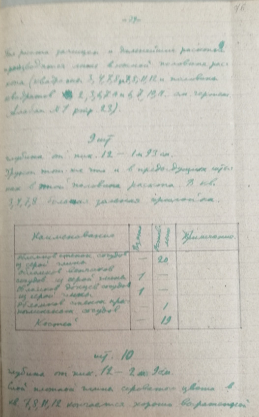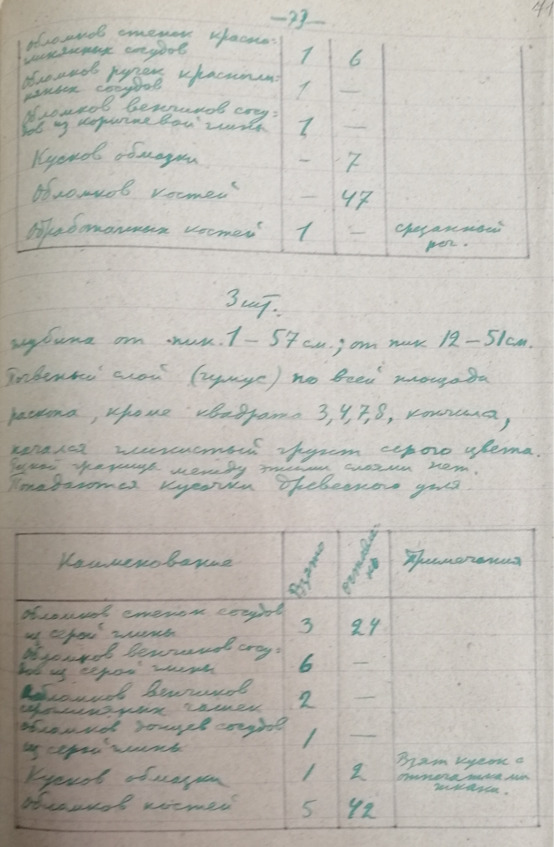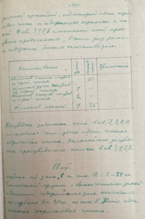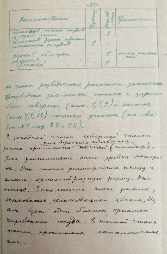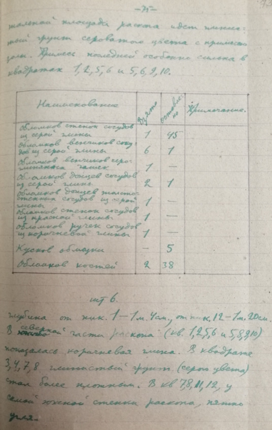 Стр. 12 …Третий костяк сохранился очень плохо. Грудная клетка и позвоночник сохранились настолько плохо, что их невозможно было зачертить. Костяк лежал на спине с вытянутыми вдоль руками. Слева от таза находился железный нож. На правой руке, на локтевой и лучевой костяк, был надет медный браслет. Череп сохранился плохо.