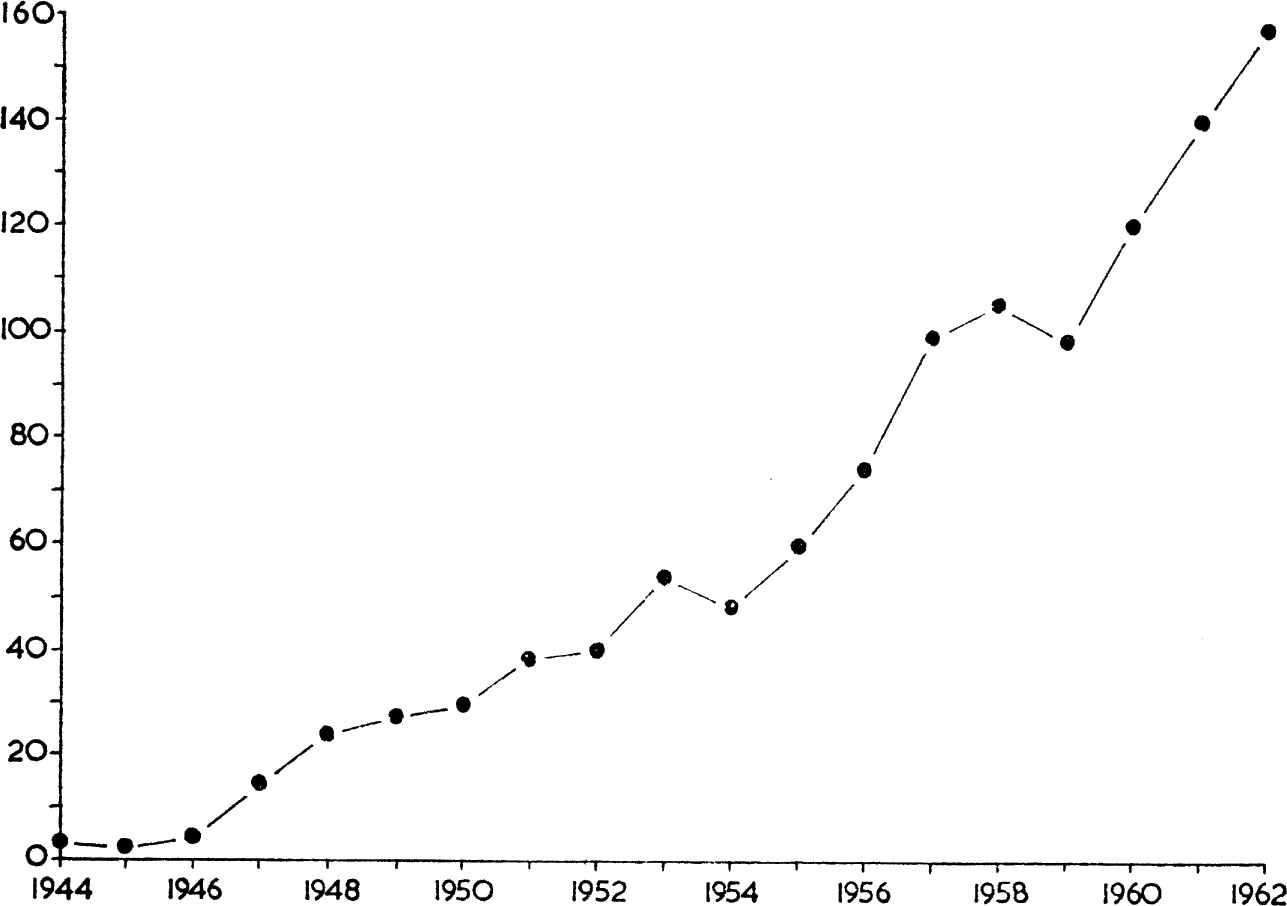 FIG. 6. Increase in number of pairs of little ringed plovers summering in Britain. (Data from Parrinder 1964).