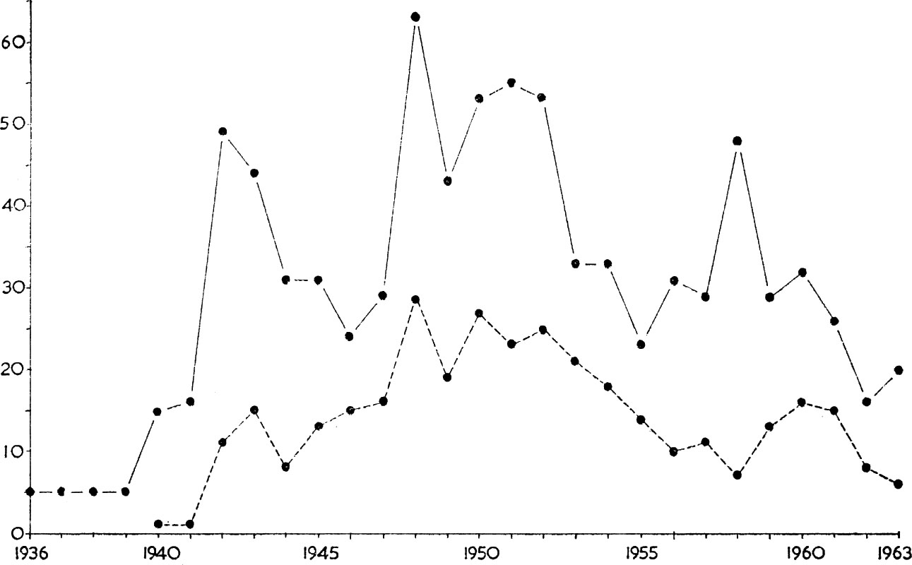 FIG. 7. Changing status of black redstart in Britain showing increase in number of territory holding males during the 1939–45 war with a decline following the final clear-up of war damaged sites after 1950. The solid line gives figures for the whole of Great Britain, while the dotted line is the contribution made by the City of London and Dover combined. (Data from Fitter 1965).