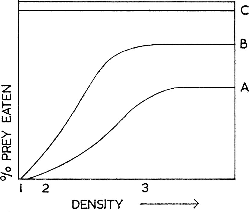 In most circumstances predators have a choice of prey and the particular item they select depends not only on prey density but also on learned individual preferences. This learning ability introduces a sigmoid stage to the functional response curve as shown in Fig. 9. This type of response curve is much more common among vertebrates and has, for instance, been found to apply to the predation by titmice on forest insects (Tinbergen 1960, Mook 1963), and has been produced experimentally with mammals in the laboratory by Holling (1965). The same curve is also found when bait, in the form of beans or peas, is spread on a grain sowing where wood-pigeons are feeding. This characteristic curve has been explained, as follows, by Leopold in 1933 and more recently by L. Tinbergen. At very low densities of the specific prey (density 1 for curve A in Fig. 9), few or none are found, and the food of the predator consists entirely of other items (100% other prey). As the specific prey density increases, a point is reached when some individuals are found by chance (density 2 in Fig. 9) and for a while the curve rises with density as chance encounters increase. But at some stage, which varies with the attractiveness of the prey, the predator learns that this particular food is available and makes a special effort to find it. The food is now found more often than by chance alone, and this causes the sigmoid stage to appear in the response curve (between densities 2 and 3 in Fig. 9). In the terminology of Tinbergen the bird now adopts a specific searching image for the prey in question. At even higher prey densities the predator again introduces variety into its diet and from now on the prey is taken at a constant rate (from density 3 onwards for curve A in Fig. 9). The level at which the intake rate of prey or the number of prey caught becomes constant depends on its palatability, that is, to what extent it is the preferred food of the predator. A high level (curve B in Fig. 9) would be found for a highly preferred prey (or in the absence of a very good alternative), as when wood-pigeons feed on tic beans spread on a clover pasture. The beans (curve B) are much preferred to clover. If the tic beans are scattered on a grain sowing, the response to beans more closely approximates to curve A because cereals are a preferred food. Nevertheless, the shape and characteristics of the response curve remain unchanged. Buzzards, as will be discussed, feed to a large extent on rabbits, if these are available. In Fig. 9 the rabbit could be represented by curve A and at pre-myxomatosis densities by the vertical line 3, that is, up to 80% of the buzzard’s diet is comprised of rabbits, other prey making up the remainder. Following myxomatosis, which virtually eliminated rabbits for a few years, the buzzards’ diet had to change in favour of other prey, and their feeding response with regard to rabbits could now be represented by the vertical line 1. As with the simple response already considered, it is important to note that above a certain point increase in prey density still does not result in a higher proportion being eaten. There is no reason why the activities of a pest-control operator or a gamekeeper would not obey curves of this kind. When an operator can kill only relatively small proportions of a pest animal, it is necessary to ensure that he does not switch from one pest to another depending on the ease of catching. For example, a rabbit catcher might undesirably be ignoring rabbits at low densities, to concentrate on catching and killing moles, pigeons and other species.