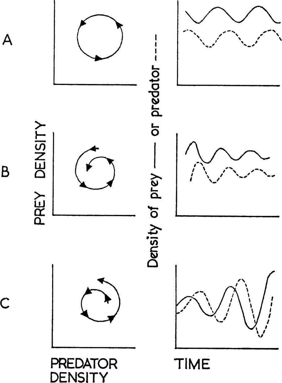 Simple systems of this kind are theoretically liable to change to the kind shown at C in Fig. 11, where the oscillations between predator and prey become self-destructive and lead to the extinction of one or the other. Feeding patterns like those shown above density 3 in Fig. 9, where increased prey density is not compensated by an increased predation (in practice more animals would usually move in to take advantage of such good feeding conditions), tend to produce violent fluctuations. One reason that such oscillations rarely occur depends on the complexity of natural ecosystems as was discussed in the previous chapter (see here). Prey is effectively isolated in groups so that if one group is accidentally exterminated it is re-populated in a density-dependent way according to its own food supply; predators tend to be less efficient at very high prey densities; and some prey have refuges enabling them to escape predation. These factors plus the existence of more than one kind of predator all help to dampen the kind of expanding oscillation seen in Fig. 11c.