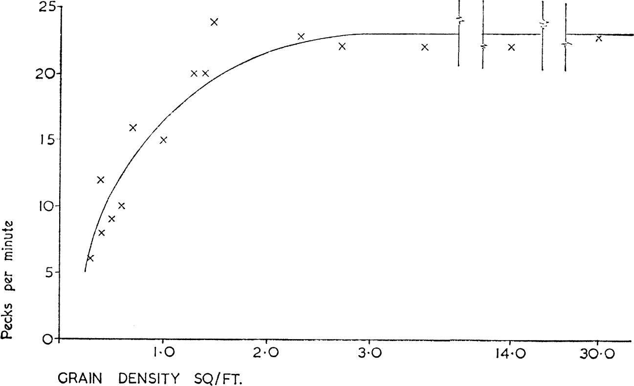 The simplest functional response shown by a predator to changes in food density is depicted in Fig. 8 based on the number of cereal grains eaten per unit time by wood-pigeons according to grain density on stubbles or sowings. The response is simple because the birds have little or no other food choice when they search the stubbles; unlike the related stock dove they do not normally respond to the presence of weed seeds. It can be seen that once grain density reaches a particular threshold the birds’ intake rate cannot be increased; this limitation is imposed because a constant amount of time is needed to pick up, manipulate and swallow each grain. The stock dove’s ability to find weed seeds on stubbles and sowings probably depends on it having shorter legs so that it is nearer the ground. In such ways birds have evolved different feeding mechanisms which are efficient in a limited range of feeding situations.