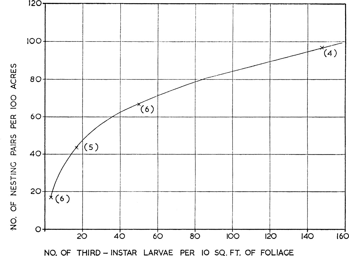 FIG. 10. Numerical response of predator to changes in prey density as shown by the number of nesting pairs of bay-breasted warblers per 100 acres of forest in relation to the number of third-instar larvae of the spruce budworm per 10 sq. ft. of foliage. (From Mook 1963).
