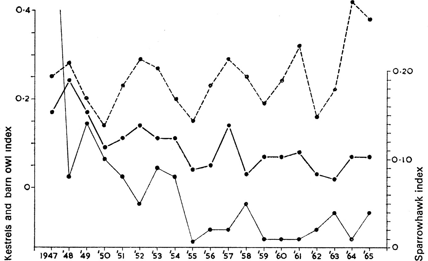FIG. 12. Number of nestling kestrels (top) barn owls (middle) or sparrowhawks (bottom) ringed each year as a percentage of all nestlings ringed under the British Trust for Ornithology scheme. The ease with which observers find nestlings to ring is assumed to be an index of the populatuon at risk. The kestrel and barn owl feed on the same small rodent species and it is noticeable that their numbers fluctuate in parallel in a manner reminiscent of the classical predator–prey curve depicted in Fig.11a. In contrast, the sparrowhawk feeds on small birds (see Table 3) and its numbers do not fluctuate in the same way. The suggestion of a decline in sparrowhawk numbers is almost certainly a true indication of the changed status of the species due to contamination of its food supply with persistent organochlorine insecticides. The risks of such contamination are very much less for species feeding on small rodents.