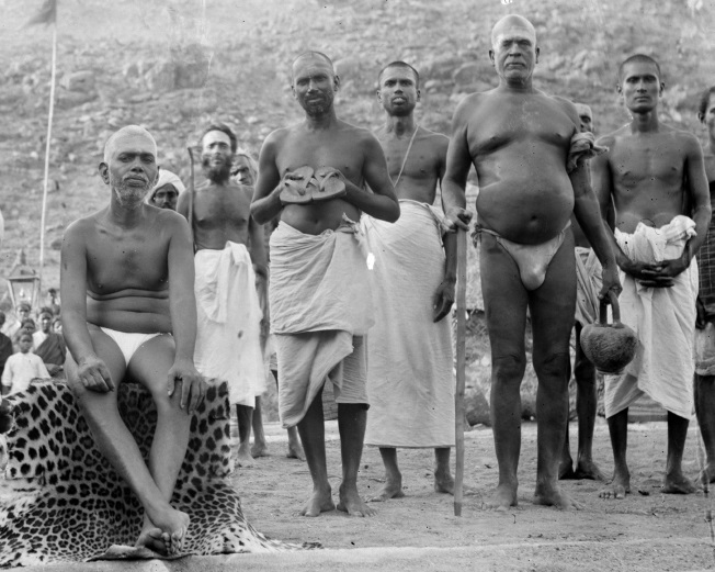 Дандапани Свами, тесть Муруганара и тот человек, который познакомил его с работами Бхагавана, держит котелок и палку. Муруганар стоит справа от него. Фото датировано 1923 годом, когда произошла первая встреча Муруганара с Бхагаваном