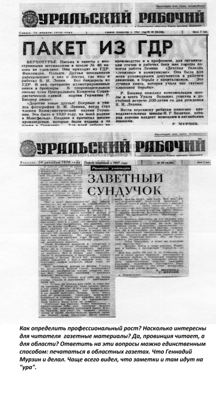 Варился в провинциальном котелке, но не забывал и об областных газетах: считал необходимым для себя, чтобы проверить, заметен ли профессиональный рост, изредка публиковаться. Сейчас-то понимаю, что это не каждому местному журналисту дано. Потому что требования высокие, совсем не те, какие в той же газете «Новая жизнь». И главное – факты, сообщаемые с мест, должны быть необычны, интересны всей области. А что нового могу рассказать из маленького городка, где до меня газетчики все излазили и обо всем не по разу написали, где жизнь течет медленно, события не новы и совсем не оригинальны, люди знают друг друга с пеленок и скрыть что-то необычное из их жизни невозможно. И все-таки находил интересных людей, о которых мои коллеги-старожилы ничего не знали. Нашел, допустим, старика, самого обычного старика, который, оказалось, с малых лет, без посторонней помощи выучил нотную грамоту, освоил многие музыкальные инструменты. Этого ему показалось мало, не имея никакого образования, взялся за сочинительство и написал более десяти симфонических произведений. На многие были положительные рецензии специалистов. Старик не стал профессиональным композитором, но жизнь прожил, благодаря музыке, интересно. Есть необычное в обычном? Да! Поэтому пишу заметку в «Уральский рабочий». Редакция, естественно, публикует. Анализирую и констатирую: без редакционного вмешательства. Значит? Отлично! Разнюхал (благодаря быстро установленным неформальным связям), что одна старушка – плетет кружева, причем занятие это семейное и передается из поколения в поколение. Самые оригинальные изделия кружевница бережет, хранит в специальном сундучке. Участвовала даже в международном конкурсе и получила диплом победителя, в результате Московский краеведческий музей запросил для раздела «Народные промыслы» лучшие работы. Все эксперты сходились в одном: у кружевницы не только тончайшее плетение, но и узоры высочайшего творческого достоинства, по сути, мастерски исполненные художественные произведения. Опять же пишу заметку и отправляю в «Уральский рабочий». Охотно и быстро опубликовали. И еще один из многих примеров. Раскопал ветерана да еще какого! Он не просто орденоносец и боевой офицер, доброволец, прошедший с боями от Москвы и до Берлина, но, оказалось, в течение двух лет командовал ротой, входившей в состав штрафного батальона, батальона смерти. Эти батальоны редко называли в открытой печати штрафными, чаще благозвучнее – штурмовыми. Очевидец? Да! Но и это не все: главное в том, что все два года вел дневниковые записи, их сохранил, проносив в полевой сумке всю войну. Увидев эти пожелтевшие от времени записи, сделанные на скорую руку, где чернилами, а где и химическим карандашом, опешил: уникальное свидетельство войны! Уникальное в том смысле, что не предназначалось для чужого глаза, а потому предельно откровенное, с деталями и фактами. Уникальное еще и потому, что на войне вести дневники и хранить было категорически запрещено. Офицер, зная это, рисковал, по сути, жизнью: узнав кто-то, не миновать бы ему трибунала, а там судили скоро и безжалостно. Ветеран и передо мной, спустя столько лет после окончания войны, раскрылся не сразу: продолжал опасаться. Снова публикация в газете, наделавшая много шума. Реакция, прямо скажу, компетентных органов была далека от положительной, 