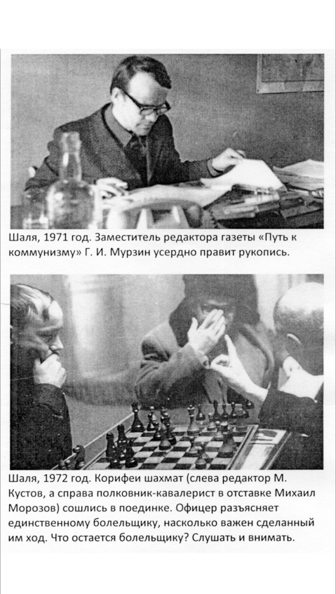 Серьезных конфликтов с редактором у меня не было, как, впрочем, и с другими сотрудниками редакции. Нравы, царившие здесь, ничем не отличались от прежних. Разве что в деталях. В прежней редакции, например, увлекались игрой на бильярде, где стук шаров перемежался со звоном наполненных до краев стаканов; в нынешней – разворачивались настоящие шахматные баталии, где бесспорным лидером и авторитетом был Михаил Кустов. К концу рабочего дня к редакции подтягивались и другие игроки райцентра. Это были очень сильные шахматисты (с моей точки зрения, конечно), которые со мной отказывались играть, считая для себя недостойным баловством. Уж больно слабо играл! Впрочем, и у меня находился партнер – шофер Борис Косинов. Мы играли с переменным успехом. Очень часто сидел и смотрел, как играли мастера. Смотрел с любопытством, но научиться чему-либо, что-то перенять из их опыта не удавалось. Решил, что не судьба. В шахматах как был, так и остался дилетантом.