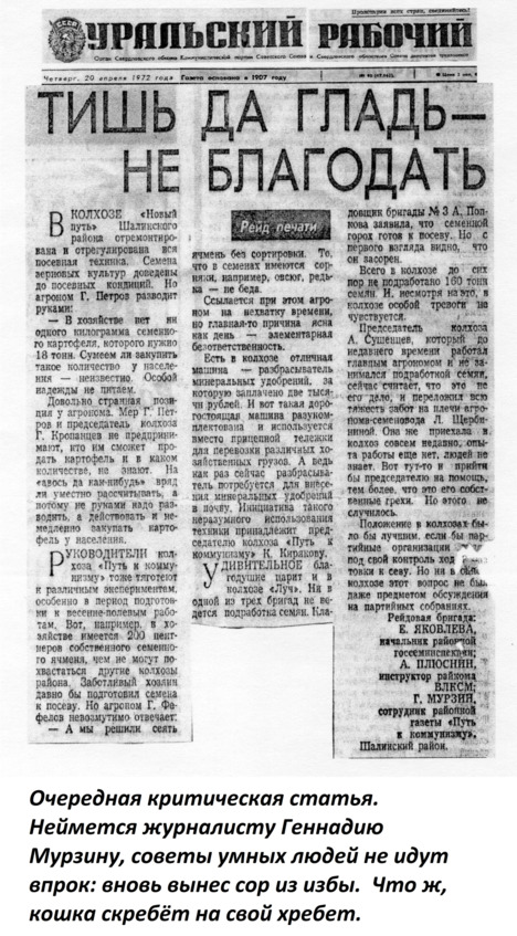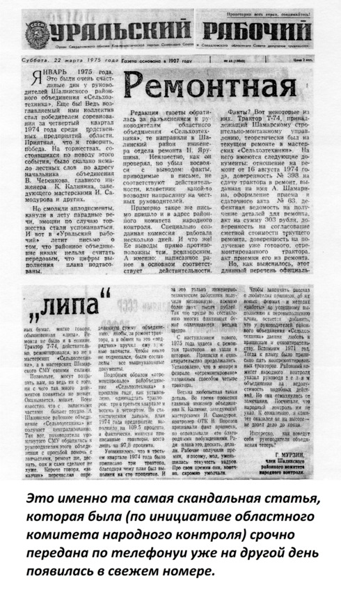 Через три дня моя корреспонденция увидела свет. Вариант подписи был принят не мой, не куратора, а третий. По материалом стояло: «Г. МУРЗИН, наш внештатный корреспондент». Компромисс был найден. Кем найден? Не знаю. По слухам, дошедшим до меня, Иван Гагарин, редактор, высказывался за то, чтобы оградить автора от возможной мести и выпустить корреспонденцию под псевдонимом. Но ему сказали, что автор категорически против этого варианта.