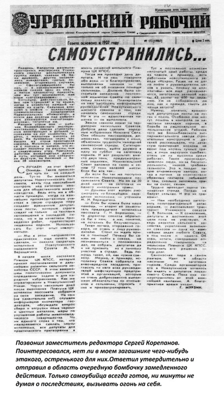 Что же произошло? Как потом мне стало известно, из обкома КПСС позвонили Михаилу Морозову, первому секретарю горкома и сообщили, что у статьи «В своем пиру похмелье» имеются два варианта увидеть свет и горком вправе сам решить, который самый подходящий: либо статья публикуется в городской газете, либо она завтра появится в областной газете «Уральский рабочий». Первый вариант для Морозова оказался предпочтительнее и он дал указание Леканову, чтобы в завтрашнем же номере статья появилась. И она появилась.