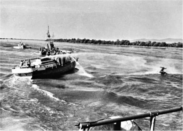 Пограничные катера с помощью брандспойтов отгоняют лодки провокаторов от советского берега