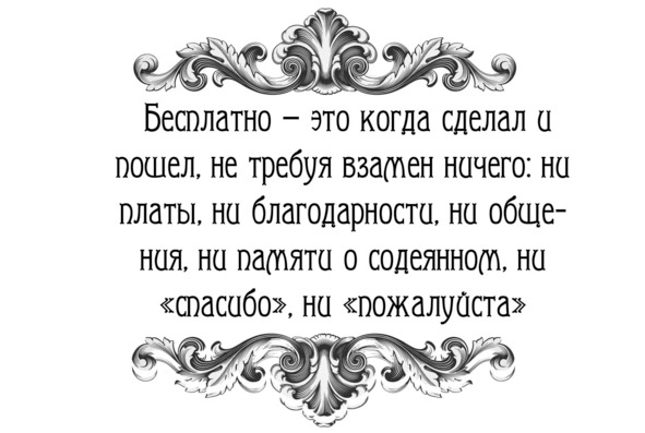 Бесплатно – это когда сделал и пошел, не требуя взамен ничего: ни платы, ни благодарности, ни общения, ни памяти о содеянном, ни «спасибо», ни «пожалуйста»