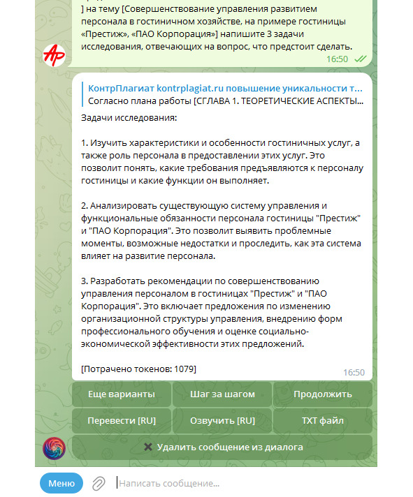 Рассмотрим пример написания плана исследования на тему: «Совершенствование управления развитием персонала в гостиничном хозяйстве, на примере гостиницы «Престиж», «ПАО Корпорация», промпт 3.