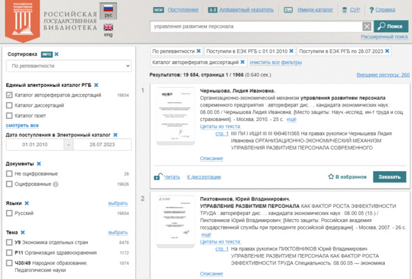 2) Научная разработанность, идем на сайт РГБ: search.rsl.ru, водим в окно поиска ключевое понятие темы, ограничиваем поиск ретроспективой 4—5 лет, выбираем «Каталог авторефератов диссертаций», см. рис. 10.