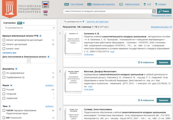 Рисунок 13 – Интерфейс сайта РГБ, поиск с фильтрами (search.rsl.ru)