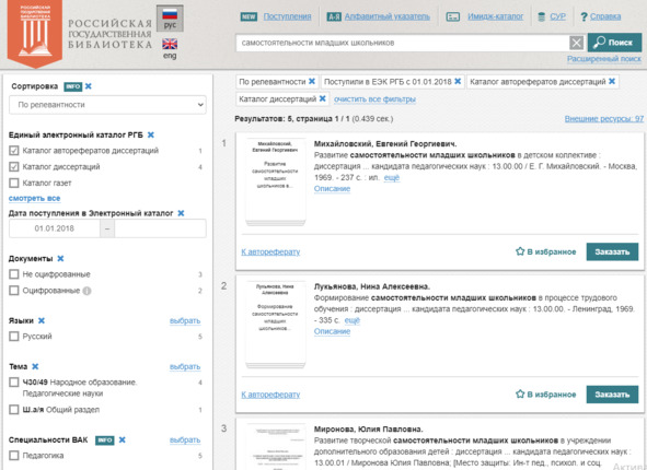 Рисунок 12 – Интерфейс сайта РГБ (search.rsl.ru)