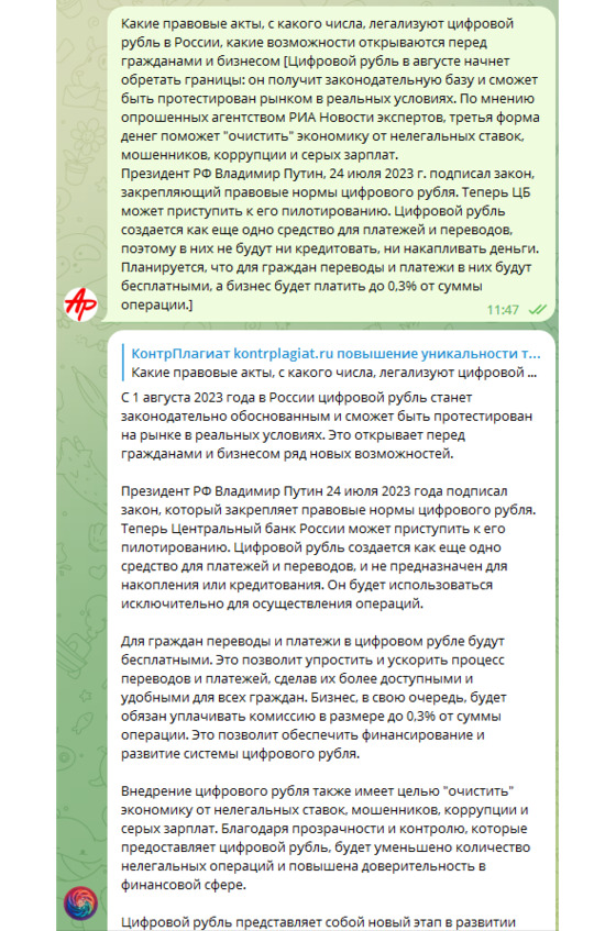 Пример генерации уникального текста нейросетью КонтрПлагиат