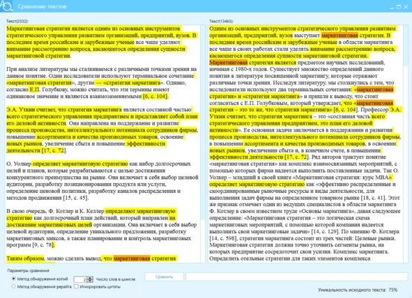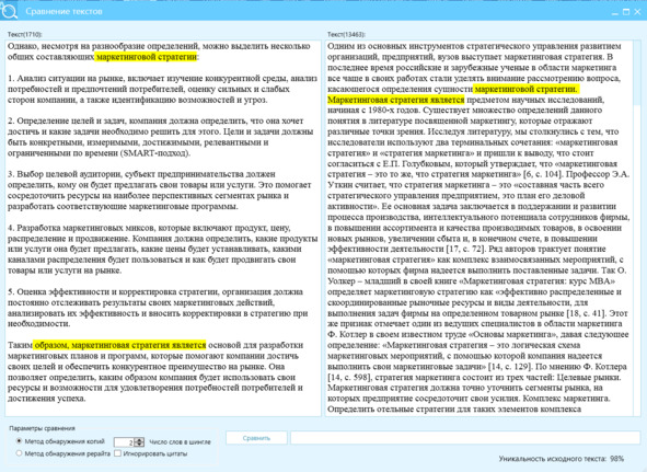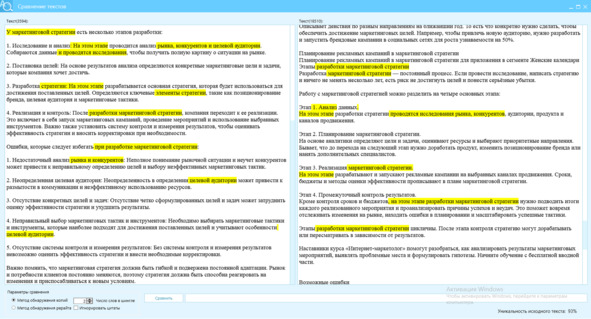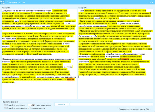 Рисунок 64 – Сверка тезисов (правое окно) и текста (левое окно), желтым цветом выделен текст, который не изменился