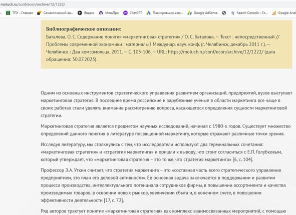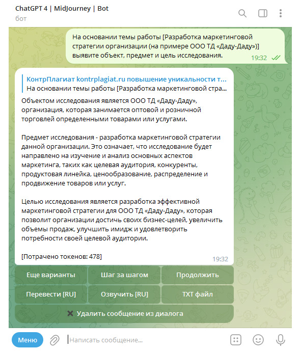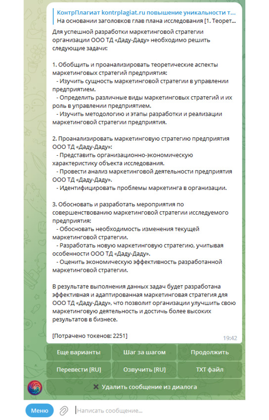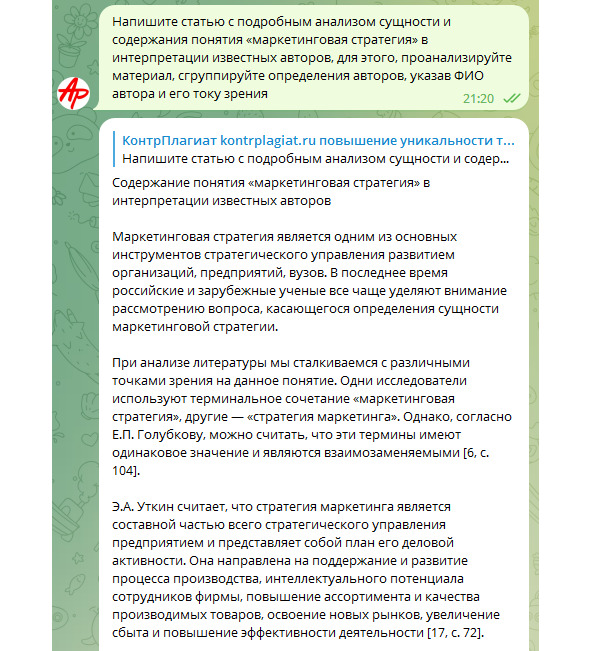 Как видно из ответа GPT текст имеет высокую оригинальность, его отличие от текстов, которые генерируются на основе примитивных запросов (примитивный запрос похож на тот, что задается поисковой системе: «составляющих маркетинговой стратегии») в том, что он не содержит циклических повторений ключевого запроса и лишен генеративной фейковости.