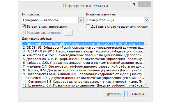 В списке использованной литературы источники с полными названиями и авторами опубликованных работ следует перечислять с указанием порядковых номеров. Такой порядок ссылок позволяет избежать повторения названий ссылок в основной части работы. Для того, чтобы не сбивать библиографические внутритекстовые ссылки рекомендуется ссылки проставлять используя средства Word: Ссылки – Перекрёстная ссылка – Нумерованный список, рис. 67. Курсор ставится перед запятой, записи в квадратных скобках, открывается меню перекрестных ссылок, курсором выделяется источник, нажимается кнопка вставить. Такой подход позволяет пересчитывать ссылки автоматически при вставке в список литературы нового источника, что заметно экономит время автора.