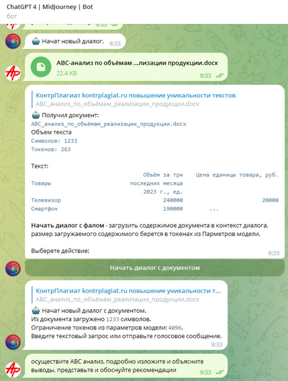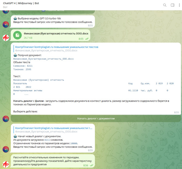 Рисунок 82 – Интерфейс ChatGPT 4 | MidJourney | Bot, начало диалога с документом