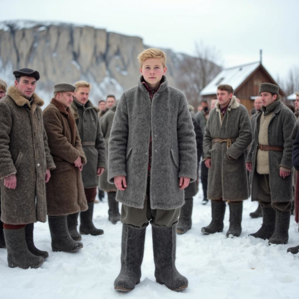 Перед выходом он нашёл в сарае огромные, старые валенки. Валенки были потрёпанные, но ещё целые. Мужчина, который носил эти валенки, наверно был в жизни настоящим русским богатырём. Валенки были настолько большими, что в них могли поместиться ещё три такие же маленькие ноги, как у мальчика. В валенках было тепло, но идти было очень тяжело.