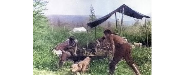 Мы вырубал молодые лиственницы на каркасы палаток и колья для их подпорок и растяжки. Затем обустраивали нары из жердей и ставили полевой таган.