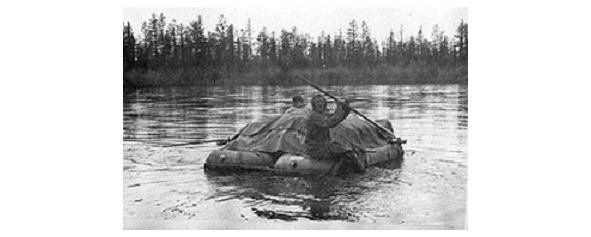 Интересна конструкция его сплавного сооружения: катамаран из двух 500-к он поставил на плот из сухих досок, к которому приделал четыре полоза-салазки (как санки). Понтоны жестко прикрепил к плоту. Таким образом увеличилась загрузка лодок, а их днища были надежно защищены от порезов на перекатах. Сооружение, конечно, довольно тяжелое и не очень хорошее для мелких рек с перекатами, но довольно остойчивое и удобное для рек с глубокими плесами.